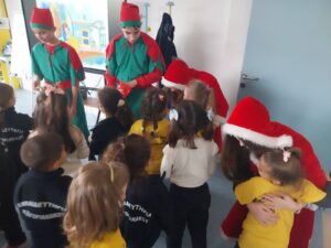 Τα μικρά παιδιά της Δροσοπηγής και της Α’’ Δημοτικού υποδέχτηκαν χαρούμενα τα χριστουγεννιάτικα ξωτικά, που γέμισαν τις τάξεις με γέλια και γιορτινή διάθεση.